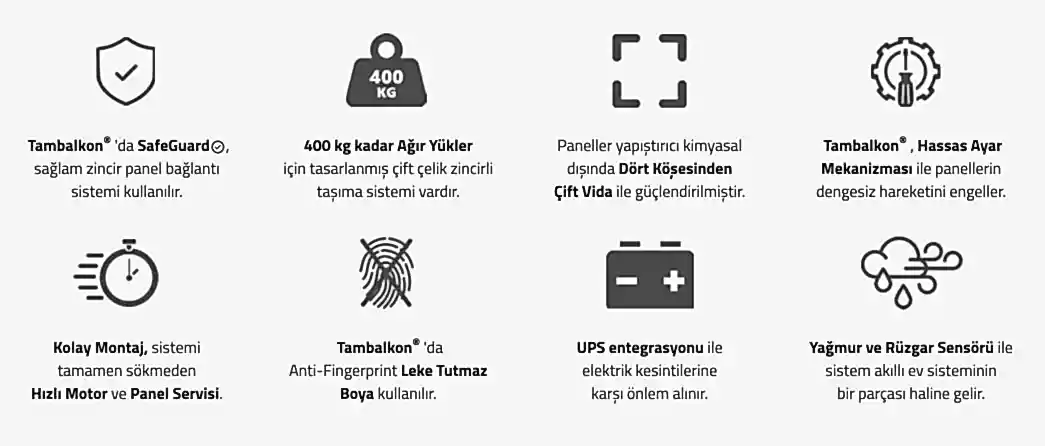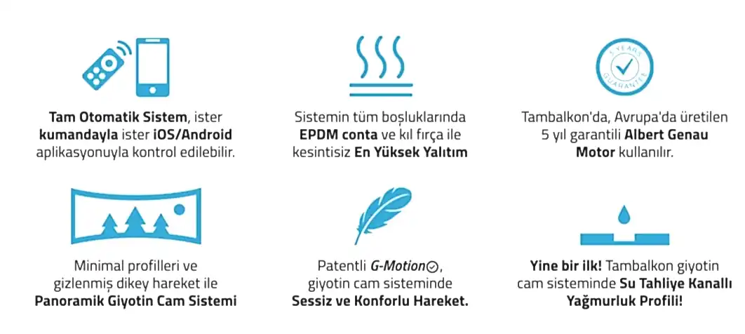 Tambalkon® , sınıfında ulașılabilmiș en yüksek, hava,su, rüzgar, ses yalıtımını garanti eder. Yağmurlu ve soğuk günler artık geride kaldı.